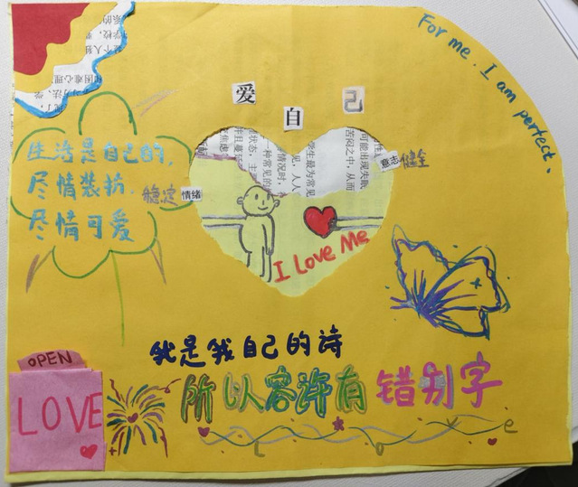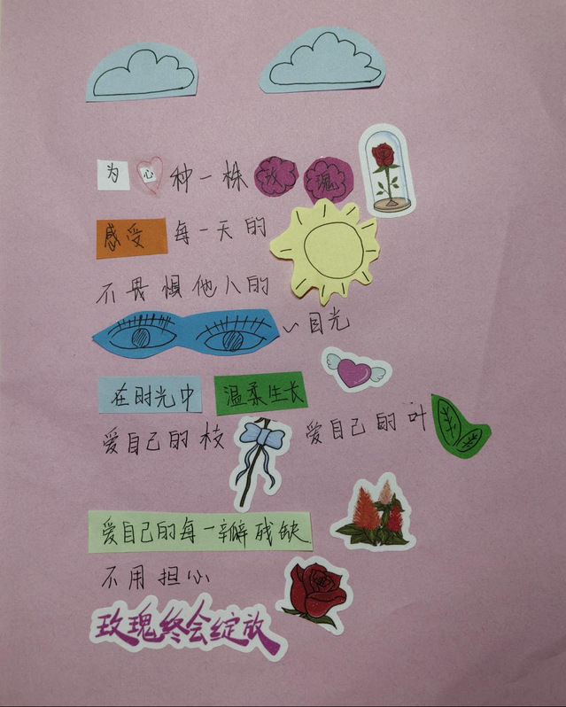“碎片诗歌实验室”是本次活动的一大亮点。同学们以“爱自己”为主题,运用旧书报、彩笔、贴画等材料,在彩色卡纸上进行创意拼贴。有的同学通过撕碎的报纸拼接出完整的心形,寓意“接纳不完美的自己”;有的同学则拼出一首爱自己的诗歌,这些作品展现了当代大学生独特的艺术表达和心理感悟。经过评审,最终评选出5份最具创意的作品并颁发院级奖状。